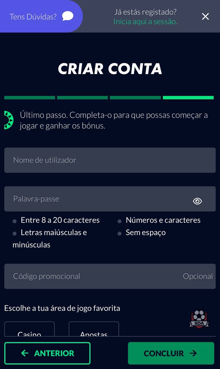 5. Informa o nome de utilizador, palavra-passe e código promocional, caso houver. Seleciona “Concluir”.