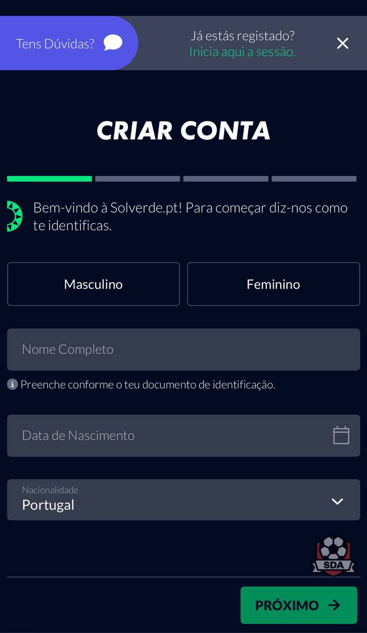 2. Insira género, nome completo, data de nascimento e nacionalidade. Clique em “Próximo”.